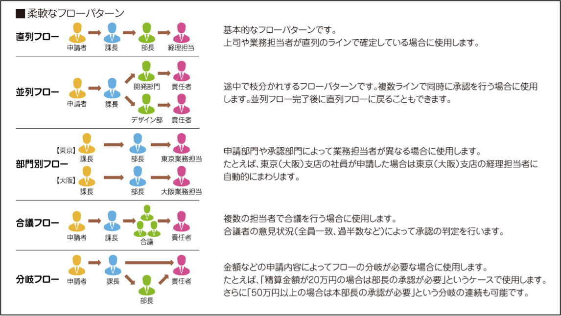 並列、直列、部門別、合議やワークフロー中に審議者や承認者を追加したり、フローを分岐させたりなど従来のワークフロー製品では対応できなかったことがMAJOR FLOWのワークフローなら対応可能です。履歴、ログ、参照権限の管理、申請者本人を承認者から除外するなどの内部統制にも対応します。